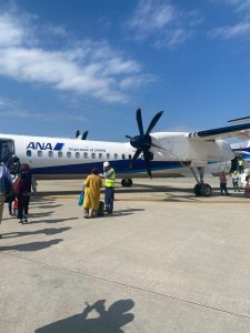 プロペラ機!観光バスがちょっと長くなった感じの旅客機です。いいですねえ。